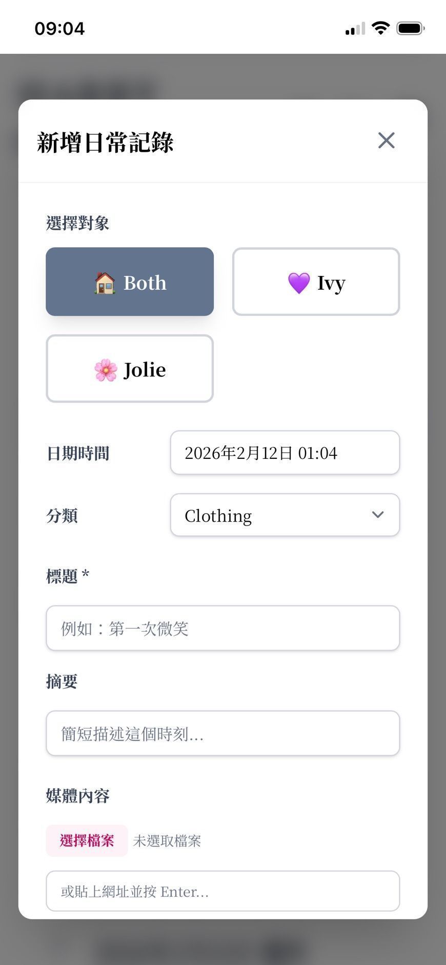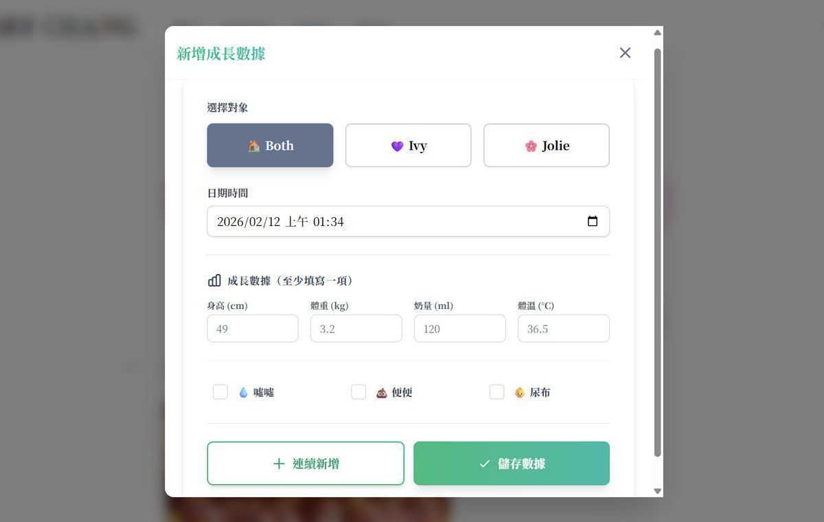 於是我打造了智慧時光軸 (Smart Timeline)。不管是用小孩姓名、日期還是類別(衣食住行)去篩選,都能在三秒內把記憶喚起。我也特別優化了「連續新增按鈕」,因為大人經常在夜晚小孩睡覺後,才有自己的時間可以一次性補登紀錄。