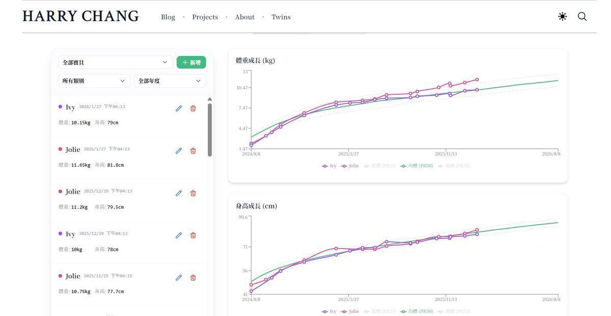 為此實作了視覺化成長曲線 (Growth Charts)。整合身高與體重的數據並將WHO的1-18歲嬰兒身高體重表匯入進行比較,當我開始維護過往紙本資料時,系統繪製出那兩條穩步爬升的曲線時,看者曲線是在PR50以上,在育兒路上就像吃了定心丸。現在帶孩子去看醫生,我們不再需要翻箱倒櫃找小冊子,直接掏出手機,圖表一開,專業感直接拉滿。